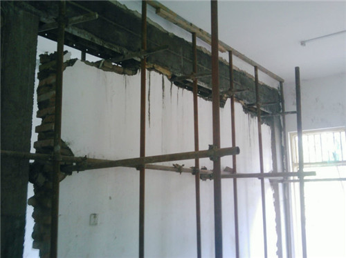 2、在需要拆除的墙体两边固定钢管,主要为了支撑楼板以保持它的平稳,而且用于支撑的钢管必须在加钢锲撑紧。