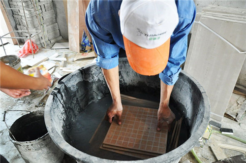 2、瓷砖粘贴前必须在清水中浸泡2小时以上,以砖体不冒泡为准,取出晾干待用。