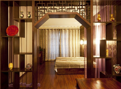 这款博古架被设计于卧室之中,对称的展示架上摆放着主人的珍藏品,很好的展现了主人的独特品味,同时,隔而不断的设计又有效的保证了卧室的采光和透气性,棕色的透明门帘设计让卧室的隐秘性变得更加的好。