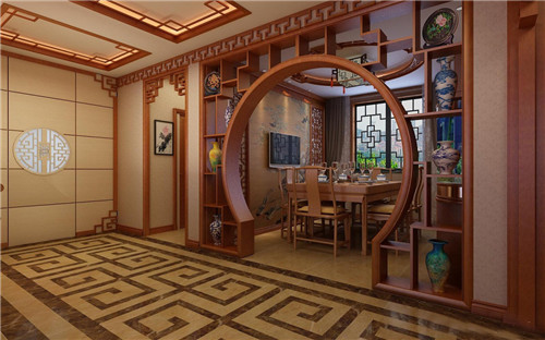 这款博古架其实还是一扇餐厅门,古典的拱形设计呈现古色古香的中式家装风格,给人别样的视觉体验,博古架上摆放着的复古瓷器,给人一种年代久远的感觉,仿佛将我们带入了古代生活一般。