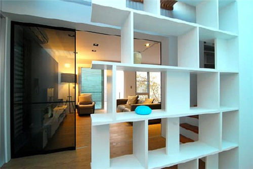 这款博古架颇具欧式风范,尽显典雅而又内敛的气质,恰到好处的隔断让空间不显空旷,除此之外,还能给人一种莫名的安全感,白色的博古架隔断墙与前方黑色的隔断相映成趣。