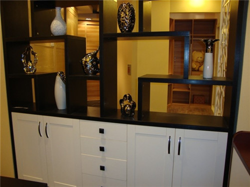 白色的橱柜搭配黑色的博古架,鲜明的色彩对比,形成别具一格的设计,上面可以陈列一些古玩,下方橱柜可以存储一些物品,一举两得的设计是很多家庭的不二选择。