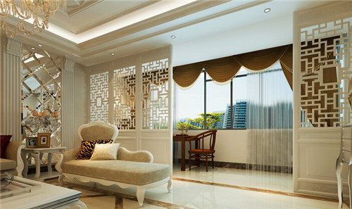 这是一款欧式风格的客厅,但是隔断却选用了中式风味的设计,宫格的造型让两个功能区相隔又相通,营造着神秘的居室气氛,白色的完美运用,将优雅与神秘展现得淋漓尽致。