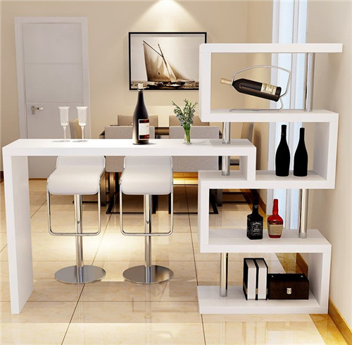 图中这款隔断,是由曲折线条的酒柜与延伸出一个小吧台组合而成,简约时尚的设计给我们带来独特的空间感和视觉美感,再搭配两张舒适的高脚椅更是绝妙,极具小资情怀的设计给人带来惊喜。