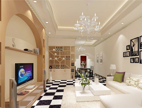 图中这款隔断酒柜既大方又时尚,下方的橱柜满足了客厅的储物功能,黑白相间的地砖搭配白色的地毯与沙发平和而富有内涵,拱形的电视墙让客厅变得空间感十足。