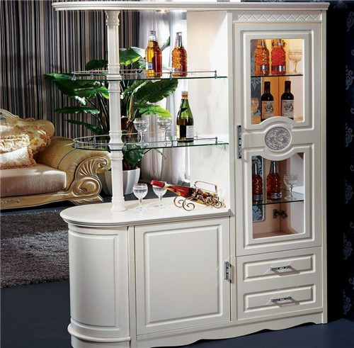 这是一款欧式风格的隔断酒柜,凹凸有致的精湛做工,给我们质感体验,透过玻璃门我们可以清晰的看见里面展示着的美酒与杯具,左侧弧形的玻璃搁板让空间更显通透明亮。