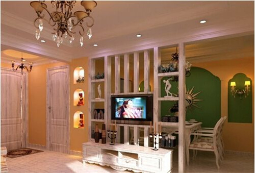 这款设计十分适合小户型,电视柜、条木和搁板组合成了一道区分空间的隔断,对称的造型让空间更显协调,隔板上摆放的艺术品瞬间提升了居室的档次,黄色的墙面搭配白色的家具,给人一种莫名的温馨感。