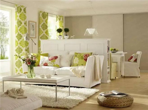 这是一个清新脱俗的小居室,白色的储物柜将客厅和餐厅巧妙分离,它同时还充当着沙发背景墙的角色,白色为主的空间色彩搭配些许草绿色的装饰,是小资们喜爱至极的一款设计,一幅简朴自然的生活画面展现在我们的面前,给人一种优雅、亲切的感觉。