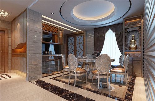 玄关再往里就是居室的餐厅,这里地面瓷砖扮演着划分区域的角色,深色的瓷砖圈出了餐厅区域,在灯光和自然光的作用下,让地砖看起来更加的通透和明亮,让人感觉格外的舒适与洁净。