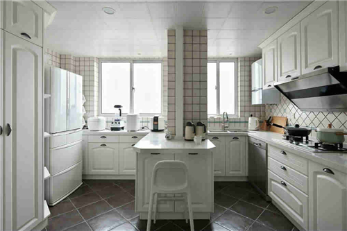 2、这间整洁大气的厨房,u型的白色大橱柜是主要功劳,裸粉色的小方砖张贴墙面,看上很温柔,地板用耐脏的褐色菱形砖铺设,在不同颜色的厨房墙地砖搭配下,整个厨房的层次感分明,带来别致的美感体验。
