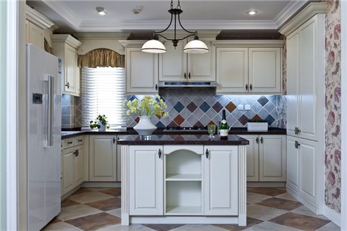 1、大家先来看第一个案例,厨房的大小适中,白色的橱柜给人很舒适的感觉,厨房面积不是很大 ,厨房的,墙壁使用了彩色的方形马赛克砖,地板则是用了菱形的文化砖,上图将厨房墙地砖搭配出美式风格, 有安静的乡村气息。