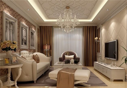 1、客厅中的软装不是华贵就是富丽,无一不透出居室的奢华姿态,而天花板上的圆形印花雕刻,搭配一盏吸顶水晶吊灯,为房间增添了豪华的美感,客厅灯具led水晶灯,通过淡雅精致的外形,透出主人的品味。