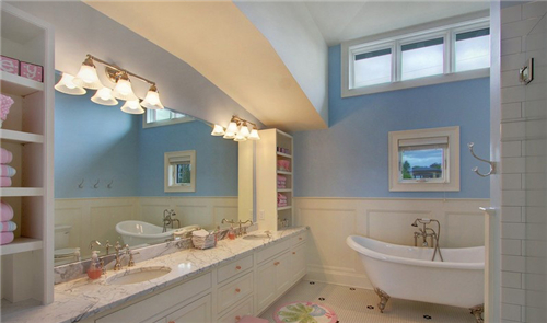 1、这间卫浴室给人很唯美、清新的感觉,墙壁用白色护墙板装饰下半部分,上半部分用天蓝色的墙漆涂刷,呈现出海洋风,靠墙处放置了一个小型浴缸,细脚支撑,显得很轻盈、灵动,毛巾和沐浴用品都在随手可得处,为主人公营造出一个方便、舒适的环境。