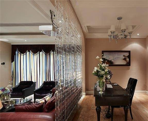 2、这个案例是很明显的采用了水晶珠帘装饰,由于起居室和用餐区选用了同系列的家具,所以用半遮掩效果的隔断,形成一种隔而不断的效果,大大提升了居室精致、时尚的感觉。