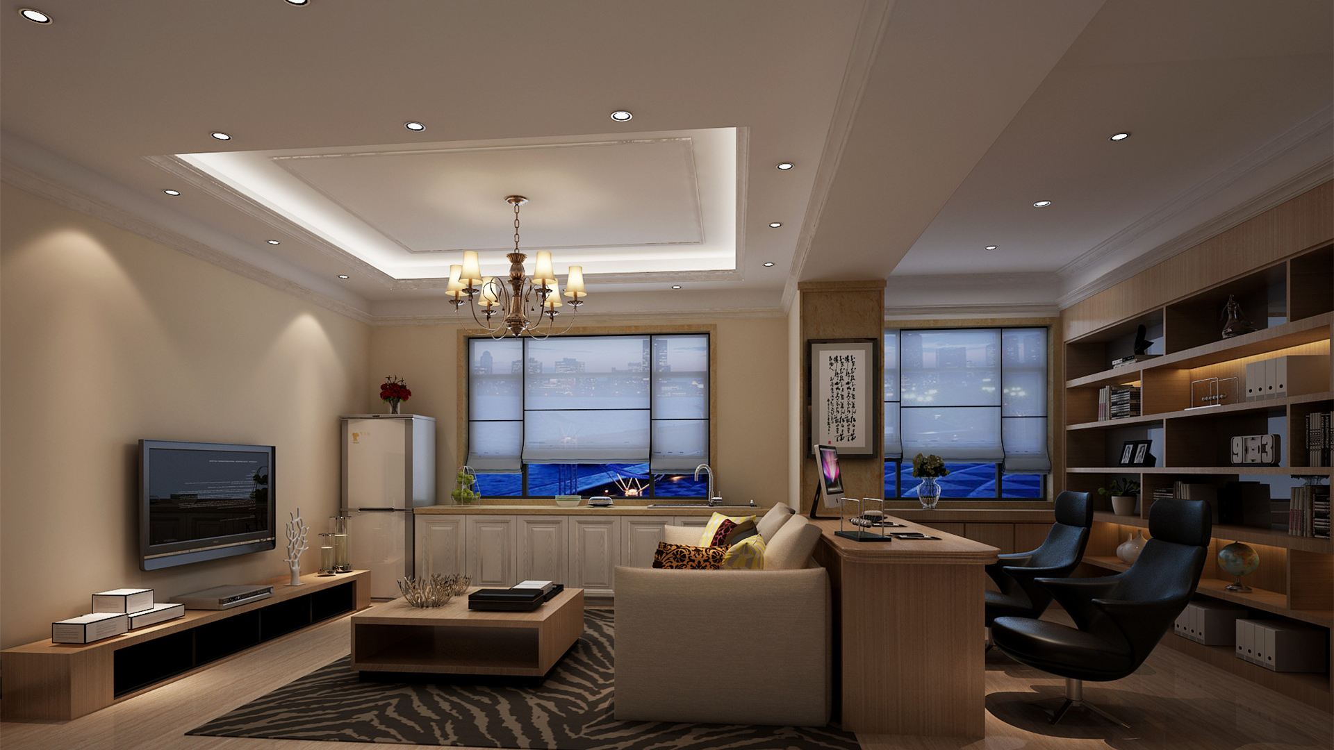 7、透过吊顶造型,可以把十字横梁纳入其中;或是运用多层次与曲线造型,透过吊顶层次,把横梁融入到吊顶造型中去。