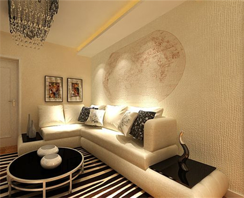 3、图三中,一个转角的L型沙发摆放,地毯是很有特色的黑白条纹拼接样式,墙面采用了浅米色粉刷设计,凹凸不平的质感给立面增添了别致的美感,硅藻泥装修图片,质感清新优雅,整体的客厅设计现代化气息浓郁。