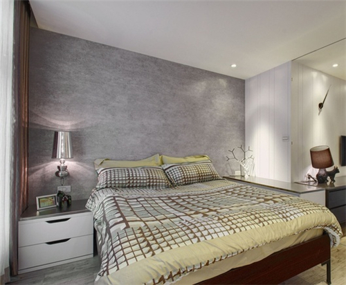 2、接下来我们来看一下第二个案例,这是一间卧室,木制大床配上格纹床单,靠着由花灰色硅藻泥打造的床头背景墙,环保朴素的灰色调墙面,与整个房间的装修搭配相协调一致,硅藻泥装修图片,暖黄色的灯光照亮整个房间,给人一种温馨舒适的感觉。
