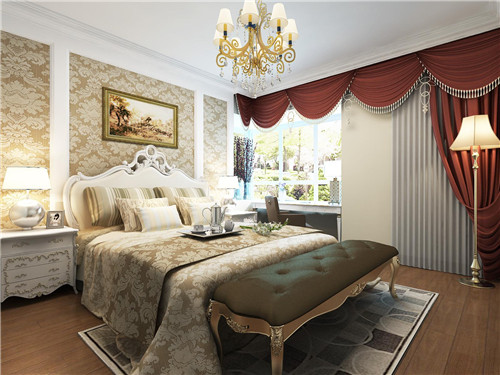 这是一个欧式风味的卧室设计,所以怎能少得了用欧式吊顶来映衬呢?白色的灯罩搭配金色的铁艺支架非常的精美,精美壁纸其花纹与被褥花纹搭配非常的协调,整个卧室散发着典雅又浪漫的气息。