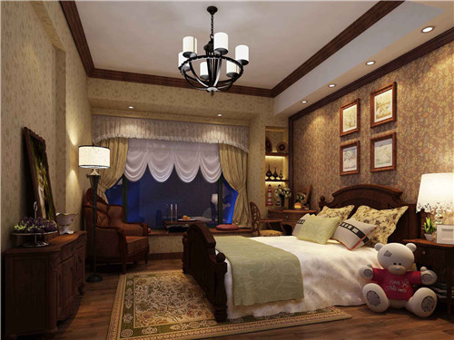深蓝色的花纹壁纸奠定了卧室的整体风格,精美的欧式吊灯成为卧室的一大特色,弥补着天花处的单调感,卧室总大量的窗户设计为空间带来了更多的光源,所以不管是休闲还是办公都非常的舒适惬意。