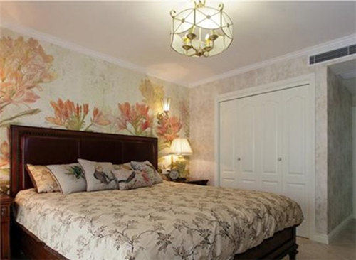 3、这间卧室让人忍不住想要在睡床上入睡,环境很优雅、静谧,墙面词采用了两种花色的壁纸,超大的红花在墙上绽放,拼贴暗纹的粉色印花墙纸,家居壁纸装修效果图写出了一个春天的风采。