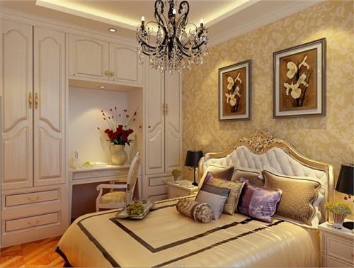 2、从图上的卧室装扮可以看出,墙面全都用米色的壁纸张贴,也不会觉得太花俏,反而看上去很舒服,古典简约的风格营造出来,还特别做了腰线设计,凸出小清新的风格,家居壁纸装修效果图,享受家的温馨和甜美的睡梦。