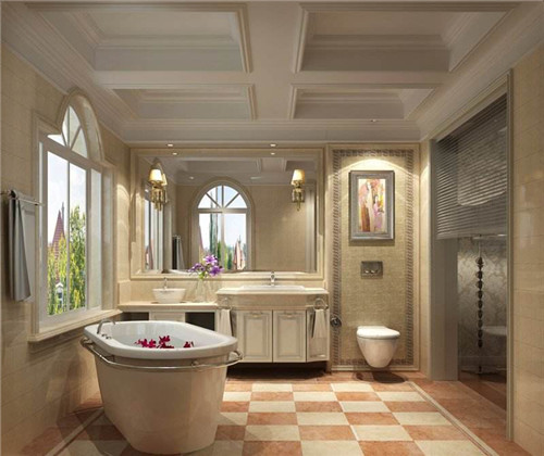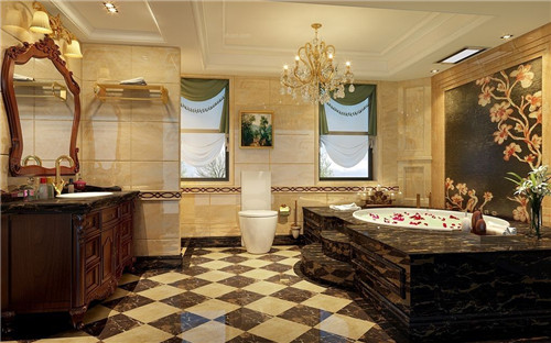 菱形的拼花地砖呈现独特的设计风范,深色的大理石装饰着浴缸台面,精美的浴缸墙尽显雍容华贵的格调,镜面的雕花设计极呈现流畅的线条美感,整个设计让我们体验到了欧式风格的典雅与浪漫。