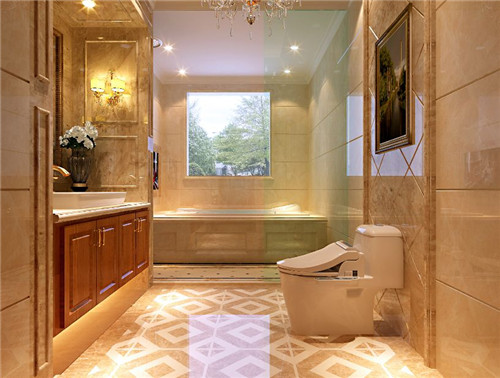 抛光拼花地砖点缀着空间地面,菱形的大理石装饰着马桶背景墙,为了不让它显得单调,主人还在半高处悬挂上一幅精美的挂画,在自然光和灯光的照射下,整个空间显得格外的亮堂。