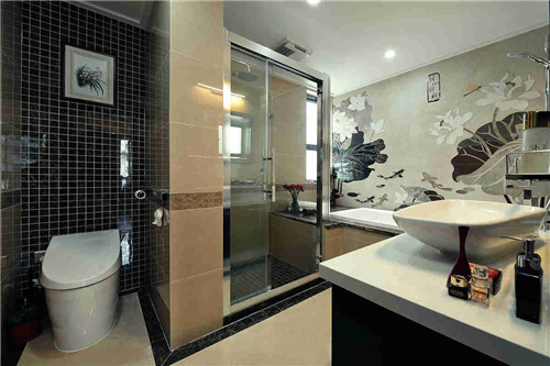 这是一款唯美大方的卫浴间设计,强烈对比的色彩给人们带来了别样的视觉美感,黑色马赛克墙砖与白色洁具搭配别有一番风味,浴缸背景墙是一面极具艺术美感的荷花图,流露着自然随性的生活气息。