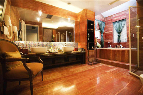这是一款东南亚风格的卫浴间设计,仿木纹的红色地砖复古而又轻奢,空气中弥漫着浓浓的自然生态的气息,置顶的墙砖设计是为了适应卫浴间的潮湿环境,古老的东南亚风格带给人视觉上的享受。